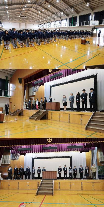 中庭でクラス発表を見た後、体育館で着任式と始業式がありました。
