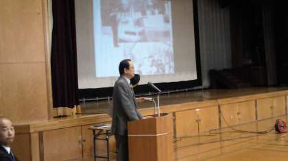 まず、講演を聴きました。修学旅行で平和研修を行う、沖縄県宜野湾市嘉数の「嘉数高台(かかすたかだい)京都の搭」と沖縄戦について、「嘉数高台 京都の搭奉賛会」代表の方に講演をしていただきました。