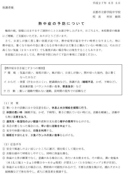 「熱中症の予防について」のプリントを配布しました。