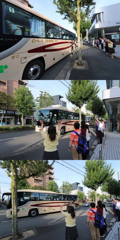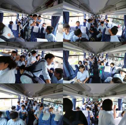 飛行機の便が早いのと、名神がリフレッシュ工事をしているため、早朝6時20分集合でした。バスで点呼を行い、6時30分頃、伊丹空港に向けて出発しました。
