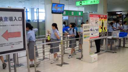 大きな荷物を預けた後、搭乗のための検査を受けています。