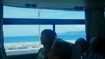 バスは国際通りに向かっています。修学旅行最終日を元気に楽しんでいます。
