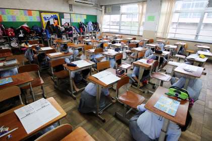・地震発生とともに机の下にもぐり、落下物から身を守る。