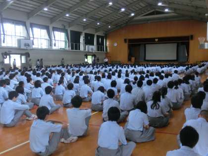 夏休みが終わり,今日から第2期のスタートです。1時間目に,照明器具が水銀灯からLEDに付け替えられた体育館で全校集会がありました。