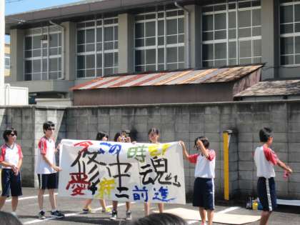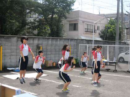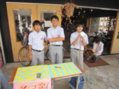 滋賀銀行の駐車場では各種イベントを行いました。実行委員会はバザーを盛り上げようと自分たちで考えたダンスと大きな習字のパフォーマンスを披露しました。また,小さなお子たちも楽しめるように輪投げなどのコーナーを設けました。