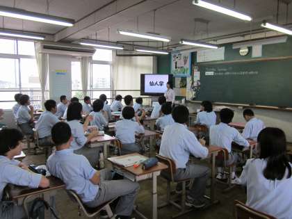 本日6限、3年生英語科の吉田倫子先生による研究授業が行われました。新しく学ぶ文法事項でしたが、クイズ形式で意味や使い方を考え、授業の後半には実際にその文法を使いながらのコミュニケーション活動で練習をしました。どの生徒も活発に活動に参加し、楽しみながら学んでいるようでした。