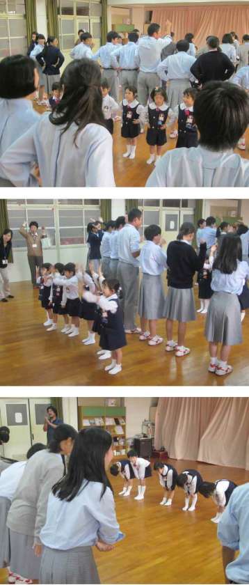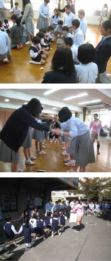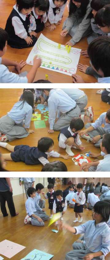 最初に中学生が合唱を披露。それに園児たちが歌や踊りで応え,仲良くあいさつして始まりました。中学生がこの日のために作った遊び道具を使って一緒に遊びます。最後に中学生から手作りの金メダルとコマを園児にプレゼントし,お見送りしました。