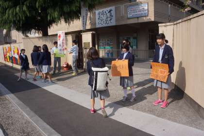 本日は,明日からの募金の呼びかけを生徒会本部役員のメンバーが朝の校門で登校してくる生徒にしていました。