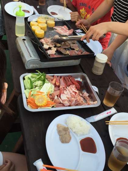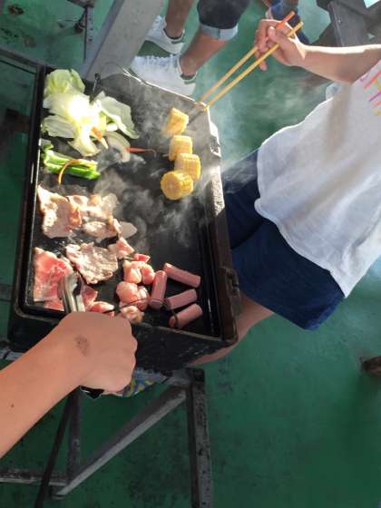 「バーベキューテラス」で全員一緒にバーベキューです。