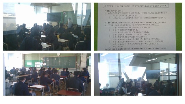 2月19日(木)各学級で「いじめアンケート」を実施しました。先日来、暴力動画の拡散が大きな社会問題になっており、文部科学省から「令和7年度中に、見過ごされている暴力行為やいじめがないかについて改めて確認を行っていただきたい。」と全国の教育委員会へ通達があり、京都市の学校でも実施することになりました。いじめや暴力は許されるものではありません。また、教育委員会が貸し出している「iPad」は間違った使い方をしてはいけません。加えてスマホを所持している人はSNSには怖さや危険があることを忘れてはなりません。修中へ通う生徒全員が、安心して生活できることを願いたいと思います。