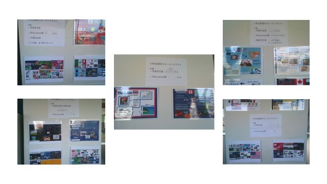2年生英語科で行われたスピーキングテストの際の、世界の国の紹介についてのプレゼン資料の表彰が行われています。各学級の中で、「校長賞」「英語科の○○先生賞」「ALTのライリー先生賞」と3つの賞が表彰されています。プレゼン資料は、各国の特徴をどれだけうまくレイアウトし、相手に伝えやすい内容になっているか、という点で評価されています。生徒の中には3つの賞をすべて独占している人もいました。今回の掲示のように、生徒たちの作品が目に見えることで、教科への関心が高まり、より主体的に授業に取り組めることを期待したいと思います。