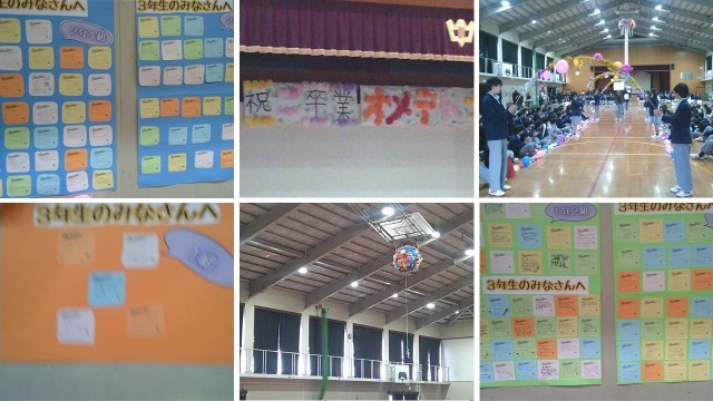 3月11日(水)3年生を送る会が行われました。昨日は代議専門委員が放課後会場設営及び体育館周辺掃除に時間をかけてくれました。舞台上には卒業を祝う看板、体育館の壁面には花飾り、そして1年生と2年生からのメッセージ。入場門にはペーパーフラワーとアーチ。そしてくす玉と、3年生の卒業をお祝いする準備が整いました。代議専門委員会の皆さんありがとうございました。
