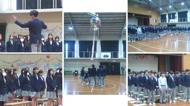 3年生を送る会もいよいよ終盤。1,2年生からのプレゼント、「くす玉」割りが成功し、3年生の群読が始まりました。「1,2年生を引っ張っていたつもりが、実は支えられていた。」「私たちはぶつかり合いながらも、話合って書き結してきた。」「次は1,2年生の番」「応援してます!」と1,2年生に激励の言葉を送っていました。そしてお礼の意味を込めた歌は「正解」。「ああ、答えがある問いばかりを教わってきたよ、だけど明日からは僕だけの正解を探しにゆくんだ、また逢う日まで」。歌詞の言葉を我がごととして歌っている3年生の心情がひしひしと伝わってきました。