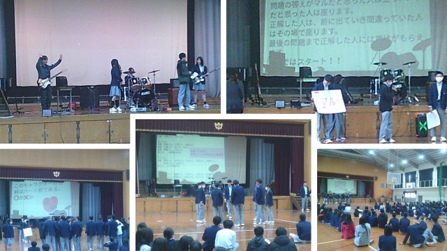 3月18日(水)2年生の学年集会が行われました。生徒たちが考えたレクリエーションが中心に行われ、〇×クイズやチャレンジゲームで盛り上がりました。最後に2年生の代表生徒が「自分たちの良いところをもっと出していきましょう。」という言葉に2年生のみんなからは拍手が湧いていました。学年主任の先生からは「みんなずいぶん成長した。ただ自分が楽しければいい、というのではなく、ルールやマナーを守って楽しむことが出来るようになってきた。先日の卒業式の3年生の姿は素晴らしかった。みんなも卒業するときには、この学校で良かったと思えるようになって欲しい。」という温かい言葉がありました。