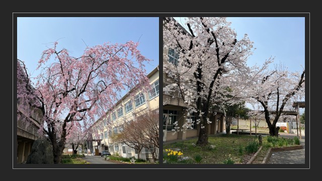 4月1日(水)令和8年度がスタートしました。校内の桜が一気に咲き始め、校門の枝垂れ桜も満開が近づいています。始業式や入学式まで花が咲いていることを願うばかりです。