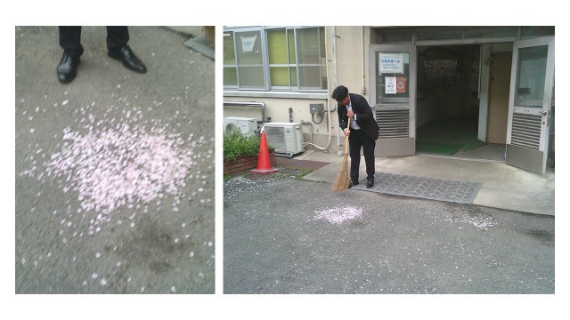 4月1日(水)午後から第1回職員会議が始まりました。この日の朝、前日の雨で桜の花びらが地面にたくさん落ちていました。そこに一人の先生がほうきを持って現れ、校舎入口前の路上の花びらを掃き始めました。前日の雨で花びらが地面に張り付いてなかなかきれいに掃けません。「もう、十分ですよ。」と校長が声をかけたのですが、「今日から新しい先生が来られるので、少しでもきれいにしておかないと。」と掃き掃除を続けておられました。「心は形を表し、形は心を表す」という言葉がありますが、人を迎えるときの気持ちはこのようでありたいものです。