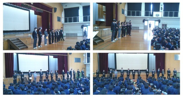 始業式のあと、担任の先生を含む学年団の発表がありました。その後は部活動顧問の発表。おひとりずつ教職員のお名前を読み上げるたびに、全校生徒からは温かい拍手が飛び交っていました。最後に「いじめ対策委員」の先生方の紹介をしました。「いじめ」が起こったときには、担任の先生に相談することが多いですが、学校にはたくさんの教職員がいますので、困っていることがあればいつでも相談しにきてください。