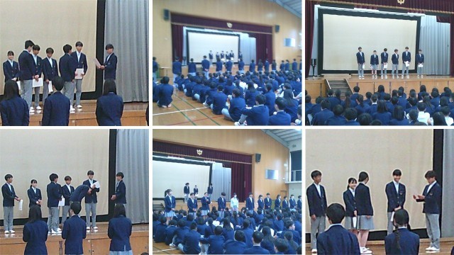 4月16日(木)全校生徒が体育館に集い、生徒会前期認証式が行われました。修学院中学校では、代議委員、生活環境委員、文化委員、体育委員、保健委員、図書委員の6つの委員会があります。先日、各学級にてそれぞれの委員を選出しました。認証式では各委員長から代表生徒に認証状が手渡されました。それぞれ委員に選出された人は「学級のために」と挑戦する気持ちを持って立候補してくれたと思います。その委員をしっかり支えることが、より良い学級、より良い修学院中学校をつくりあげていくことになります。みなさんで委員をしっかりとサポートしてあげてください。