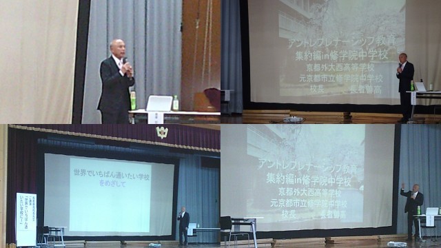 4月17日(金)長者善高校長先生をお招きし、ご講演を行っていただきました。まず、「世界でいちばん通いたい学校に!」の標語はどのようにして出来たのかをお話していただきました。世界で「いちばん」はひらがなで表記してあること。「一番」になってしまうと順列をつけてしまうものになる。自分にとっての「いちばん」良い学校をつくっていって欲しいという願いがあったそうです。また、当時取り組まれていたアントレプレナーシップ教育については、映像を動画で流してくださり、当時の修学院中学校の生徒が生き生きと活動している姿が伝わってきました。自分自身でアイデアを出し、そして調べ、課題を解決し、周囲から意見をもらって改善していくというまさしく探究的な学習の流れが実践されていました。動画には15年ほど前の卒業生の活動が映し出されていましたが、会場にいた現在の修中の生徒たちは、自分のこれから活動する未来の姿として映ったのではないでしょうか。※長者善高校長先生:平成14年から平成22年まで8年間修学院中学校の校長を務められる。学校教育目標「世界でいちばん通いたい学校に」の標語を掲げられ、アントレプレナーシップの取組で地域の商店街と学校をつなぎ、「地域に開かれた学校」を推進された。現在は京都外大西高等学校の校長を務めておられる。
