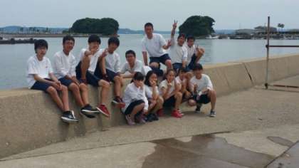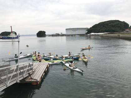 田代地区の体験,シーカヤック組です。天気も波も穏やかで,とても良い活動になりました。まだ,ここに居たい〜,という声もありましたが…。名残惜しみながら,離村式に向かいます。