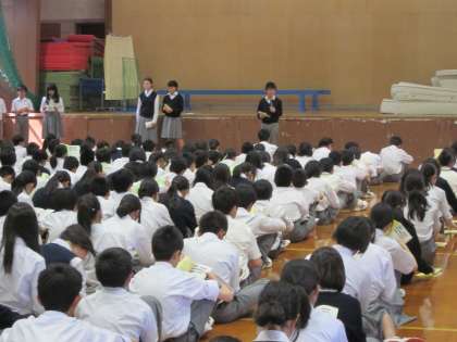 3年生の修学旅行がいよいよ終盤を迎えました。学校では,明日の校外学習を直前に控えて,1年生と2年生がそれぞれ学年集会を行っています。