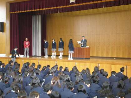 全校集会では、校長先生のお話、伝達表彰(前回の全校集会がインフルエンザのため放送となったので、今までに各分野で生徒の活躍の多くあり、非常に長い表彰となりました)、そして生徒会からのアピールなどがありました。