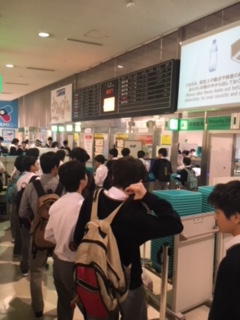 やっぱり,はじめてのセキュリティチェックにどのクラスもドキドキ!!無事全員,問題なく搭乗できるでしょうか?これもあまりできない体験ですね。さあ,いよいよ30分後には,沖縄に向けて,洛中生を乗せてANA765便が伊丹空港を離陸です。