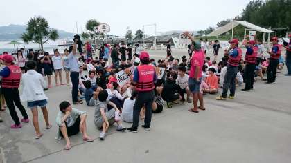 午後から,B班(2組,8組,9組,10組,11組)は,もとぶ元気村での「マリン&文化体験」です。マスクスイミング,バナナボート,カヌー,コーラルビュークルーシング,サバニ,小型ヨット,ドフィンガイドツアー,ジェルキャンドル作りの8種目へのチャレンジが始まろうとしています。じっとしているだけで汗が出るくらい暑いです。