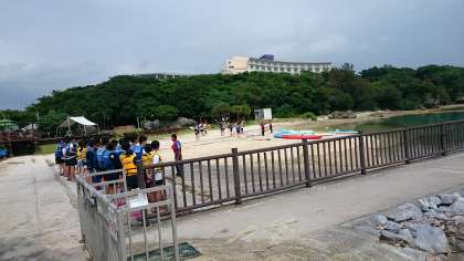 B班のマリン&文化体験も順調に進んでいます。曇り空から日差しが出てきました。写真はカヌー,小型ヨット体験の準備の様子です。ライフジャケットを身について真剣に説明を聞いています。