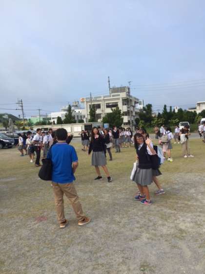 2泊の民泊を終え,各班,民家さんに送られ本部町立公民館に戻ってきました。記念撮影のあと退町式でしっかり挨拶をしお別れをしました。笑顔と涙のお別れとなりました。これから国際通りへ向かいます。天気は曇っています。