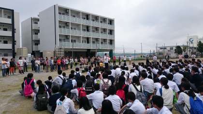お世話になった民泊先のご家族とのお別れです。本部町立公民館前のグランドで退町式が生徒の代表の司会で行われました。2晩を共に過ごして,きっと深いきずなができたことでしょう。家族同様に過ごさせてもらったお礼をみんなで表現できました。お別れが寂しくて涙を流して泣いている班もありました。