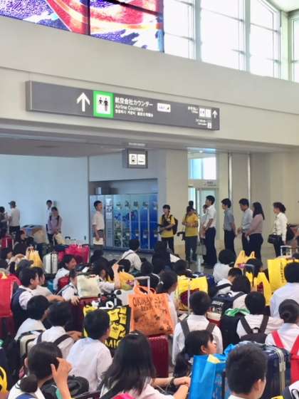 修学旅行も最終盤です。那覇空港で添乗員さん,写真屋さんにお礼言ったあと,搭乗のためのチェックを受けています。2度目とあって慣れた様子です。さあ,これからいよいよ搭乗です。