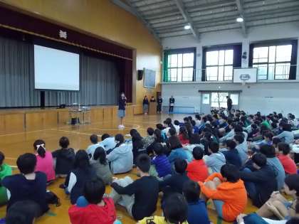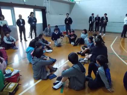 初めに生徒会本部のメンバーによる学校生活の様子や部活動紹介を見てもらい,学校に関係のある問題を出しグループになって答えを考えてもらいました。