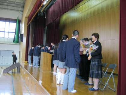 そして、生徒代表からあいさつ、花束の贈呈、そのあと保護者の方からの花束が贈られて、離任される教職員の方々を送りました。