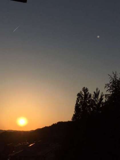 休校期間,みなさんはどのように気分転換をしていますか?私はきれいな夕焼けを見ると気持ちがゆったりとします。この写真は先日洛北中学校の中校舎3階から撮ったものです。お天気のいい日の夕方西の空を見ると太陽周辺が朱色に染まり,上空になるにつれて紺色になっていくグラデーションがとてもきれいです。遮光版を通して太陽を見ると,みるみるうちに太陽が沈んでいくのもわかります。