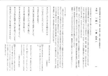 先日このコーナーで「夕焼け」のお話をしました。夕焼け=太陽の話だったのですが,それを読まれた国語科の吉村先生から,「私は家庭学習プリントで『月』をテーマにしたものを作りました。こんな時期だからこそたまにはゆっくり月をながめてみるのもいいのでは」と話されていました。ちなみに上の写真はそのプリントです。「月の下で(光村推古書院)」の一節が引用されています。