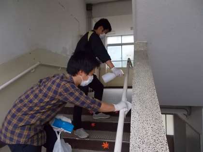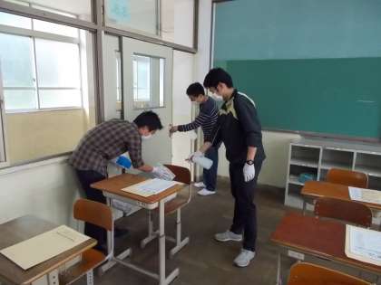 今日は主に2年生のご家庭に電話連絡をし,健康状態や生活のようすなどを聞かせていただきました。みなさん健康にすごせているようでひと安心です。 さて来週は面談・登校日がありますね。各学年の先生方はその準備をしています。上の写真は3年生の先生方が教室の消毒作業をしているところです。教室の机や椅子,電灯のスイッチ,扉のとって,階段の手すりなどをすべて消毒しました。来週,みなさんに会えるのをとっても楽しみにしています。