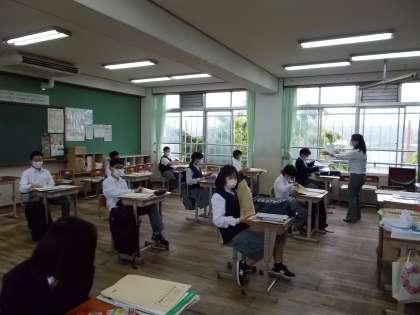 各クラスで休校中のお家でのようすや健康状態について聞かせてもらったり,提出物・配布物の確認などをしました。1年生はクラスの友だちの名前を覚える前に休校になってしまったので,教室の中で少し緊張しているようすの人もいました。これからだんだん慣れていくので心配ないですよ!