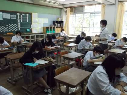 B班は午後から登校しました。A班と同様に3コマの授業があります。上の写真は2年6組技術科の授業です。1回目の授業だったので,授業の進め方を確認し,各自自己紹介カードを作成しました。下の写真は2年7組数学科の授業です。1から9の数字が順番に並んでいて,その数字を+や−などの四則演算でつないでいって,最終的な計算結果が100になるようにしてみよう,という問題を考えていました。私も挑戦してみましたが・・・まだできません・・・。