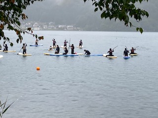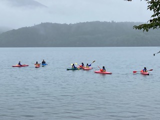 幸いにも雨が小降りになってきたようです。この写真はSUPとカヤックの体験をしているところです。静かな湖面で鳥の声も聞こえてきそうです。気持ちよさそう!