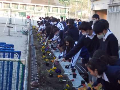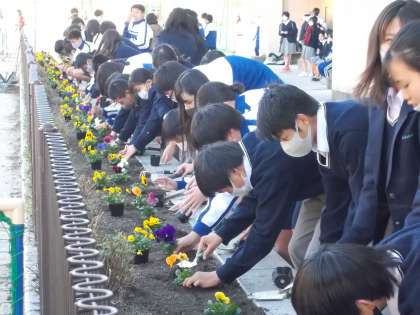 美化委員会と地域のみなさまで,テニスコート横の花壇にパンジーとビオラを植えていただきました。比叡山を背景にしながらとても華やかになりました。大変寒い中でしたがみなさんありがとうございました。大切に育てていきましょう。