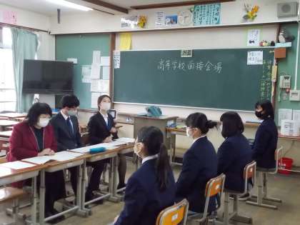 放課後,3年生は受験に向けて面接練習をしました。1,2年生の先生方に面接官になってもらい,「この学校を志望した動機はなんですか」,「中学校で一番頑張ったことはどんなことですか」などの質問に,緊張した面持ちで答えていました。暖かい春はもうすぐそこ。がんばって!