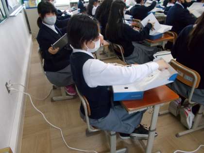 先月末に不足分のタブレットが学校に届き,ようやく1年生でもタブレットを使った授業が始まりました。割り当てられたタブレットを箱から出して,各自のID,パスワードを入力して早速立ち上げ,基本操作の確認をしました。今日は偶数クラスの使用でしたので,明後日の授業は奇数クラスが使用します。