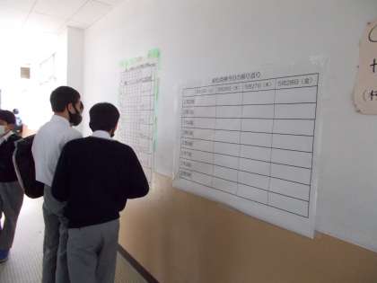 先週の生活点検週間に引き続き,今週は美化点検週間です。生活点検結果の表の横や向かい側に美化点検表が掲示されています。掲示物には1日ごとの各クラスの美化目標が記載されています。