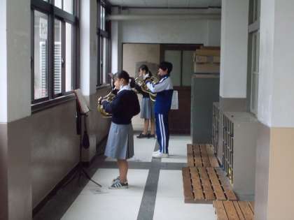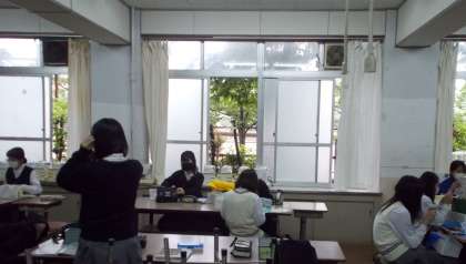 今日は朝からあいにくの空模様で,グランドは使えない状態でした。そんな中,感染予防対策をしながら部活動が行われていました。武道場や教室の窓は開けたままです。風が中に吹き込んでピン球が微妙に不規則に動いたでしょう。でもそれもまた練習です。吹奏楽部は学校内のいろいろな箇所に分散して,壁のほうを向いて演奏の練習です。家庭科部もできるだけ会話を控えています。みんな本当にすごいです。