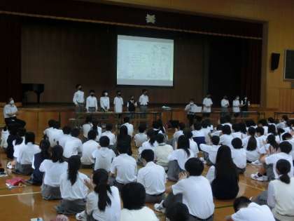 1学期の振り返りを各委員会の学年代表の生徒のみなさんが中心となって発表しましたがその内容が素晴らしい!良かった点,課題で来学期みんなで取り組んでいきたいことを,要点をまとめてわかりやすく説明してくれていました。言語活動の中でも「伝える(話す)」は最も難しいにもかかわらず,しっかりできていたのでみんなが集中して「聞く」「理解する」ことができていました。