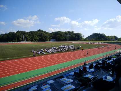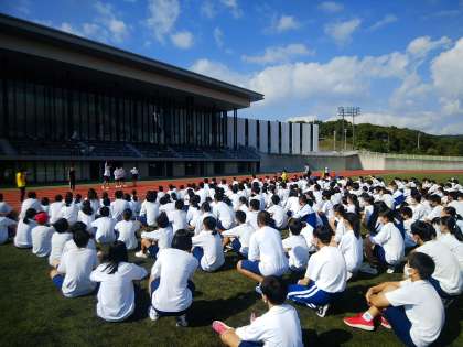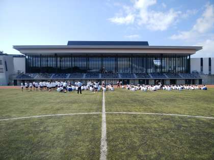 田辺スポーツパークに到着しました。ここで学年レクレーションを行います。全員が集合してルールなど詳細を聞いています。