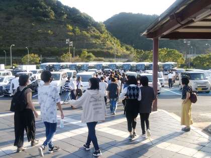 先程,休憩場所の岸和田SAを出発しました。交通渋滞がないと18時ごろ校区内にバスが到着する予定です。校区に近づいてきましたら連絡させていただきます。