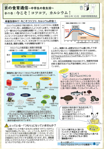 今日全校生徒のみなさんに,京の食育通信 参の巻「今こそ!コツコツ,カルシウム!」を配布しました。