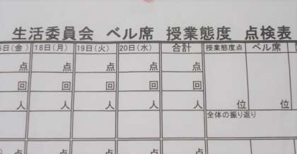本校ではテスト1週間前に生活委員会主催の「生活点検」,美化委員主催の「美化点検」が行われることが常になっています。現在生活点検が行われ,ベル着や授業態度を委員の人が中心になって確認しています。